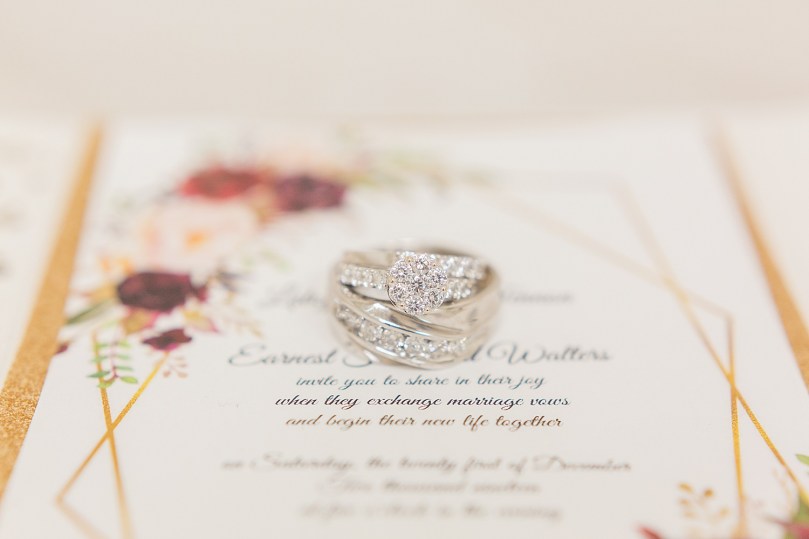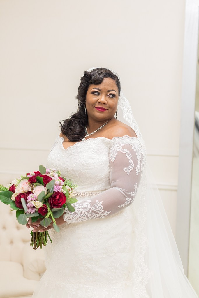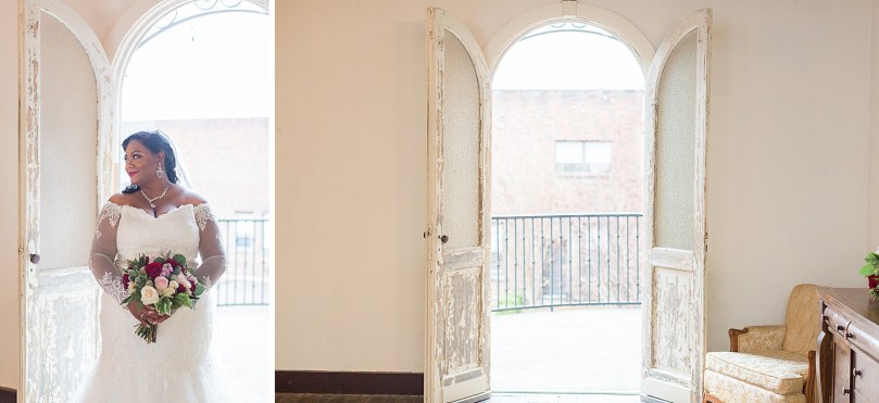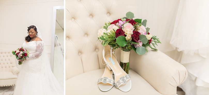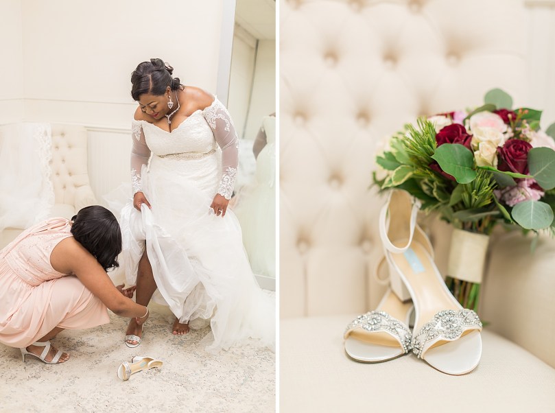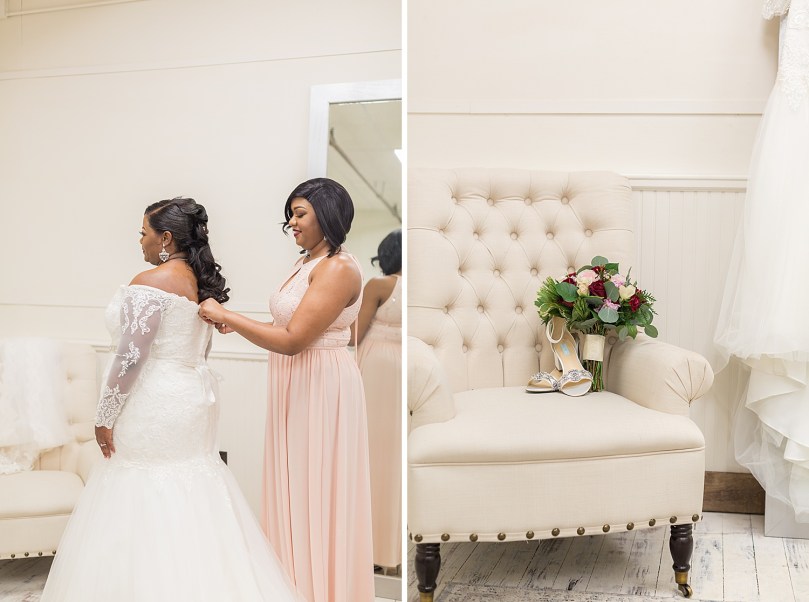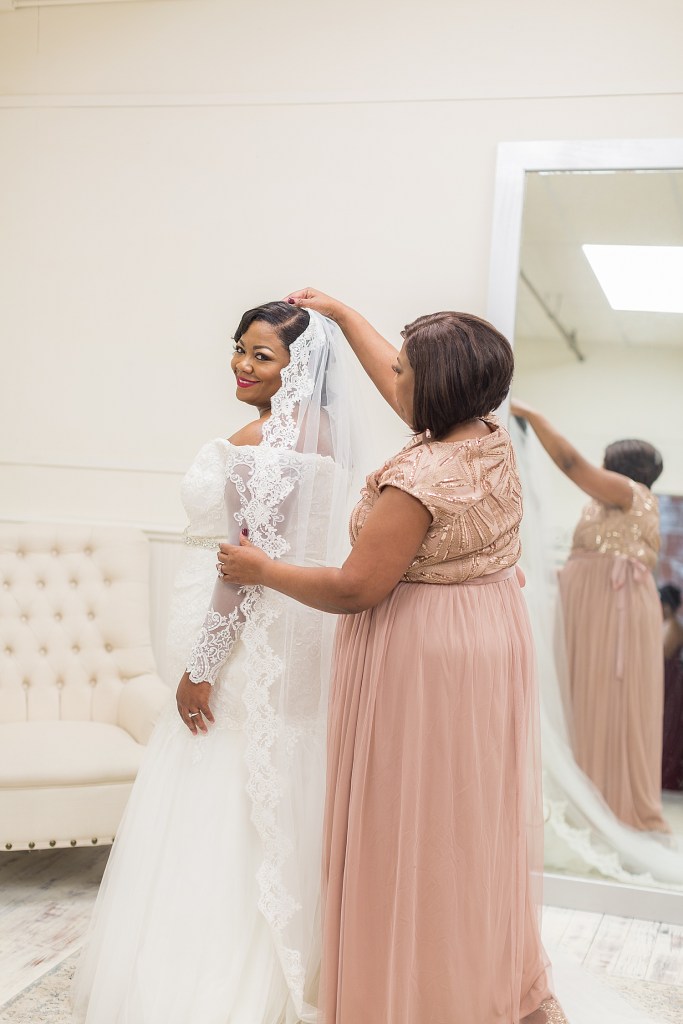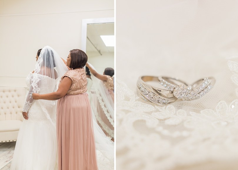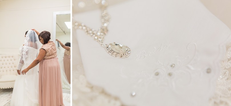 When I first arrived to the venue, Latoya had the biggest smile on her face. I could tell that she was ready for her big day! I loved her wedding bouquet and long beautiful veil. I even used her veil to photograph her beautiful details on! It was also sweet watching the girls help Latoya get dressed and ready for her big day. While Latoya & her girls were getting ready, they took the cutest photo in their matching robes!